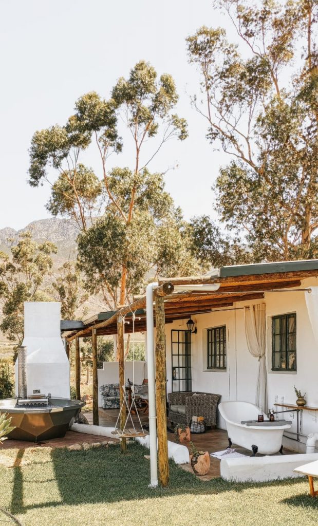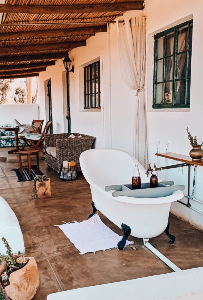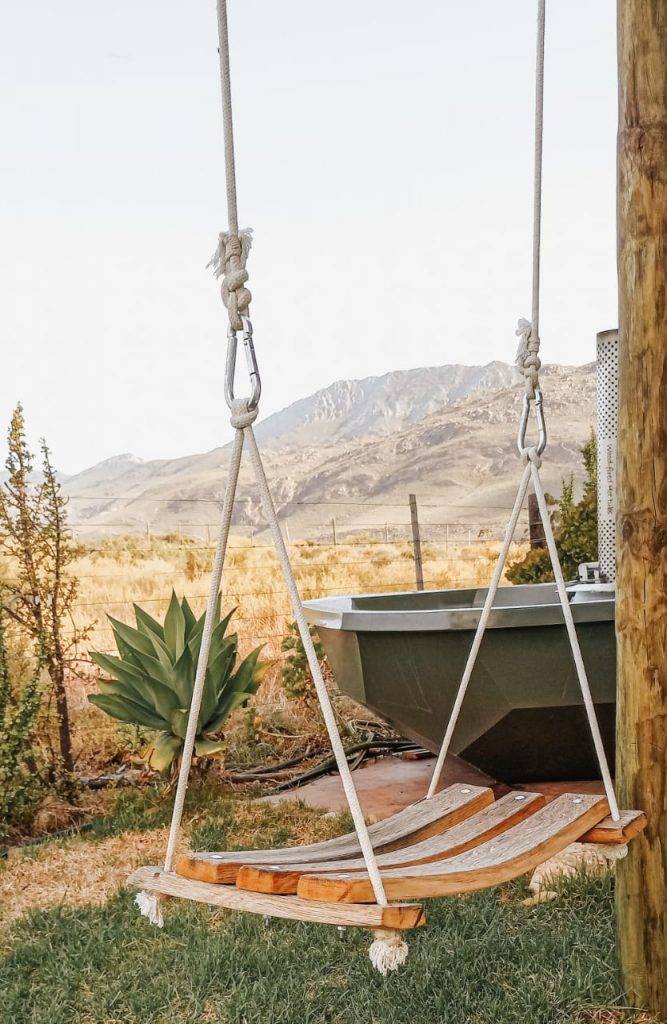 The outdoor patio (our favourite) has a braai, comfortable seating, loungers, an outdoor wood-fired hot tub and a bathtub. Oh and let’s not forget the dreamy swing – loooooved it!